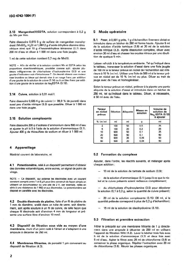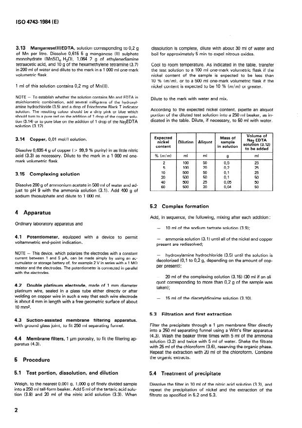 ISO 4743:1984 is a standard published by the International Organization for Standardization (ISO). Its full title is "Copper alloys — Determination of nickel content — Titrimetric method". This standard covers: The method is applicable to contents of nickel as an alloying element in all types of copper alloys listed in International Standards. ISO 4743 specifies principle, reagents, apparatus, procedure, expression of results and test report.