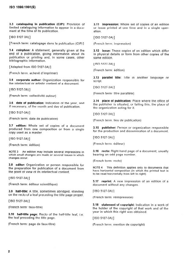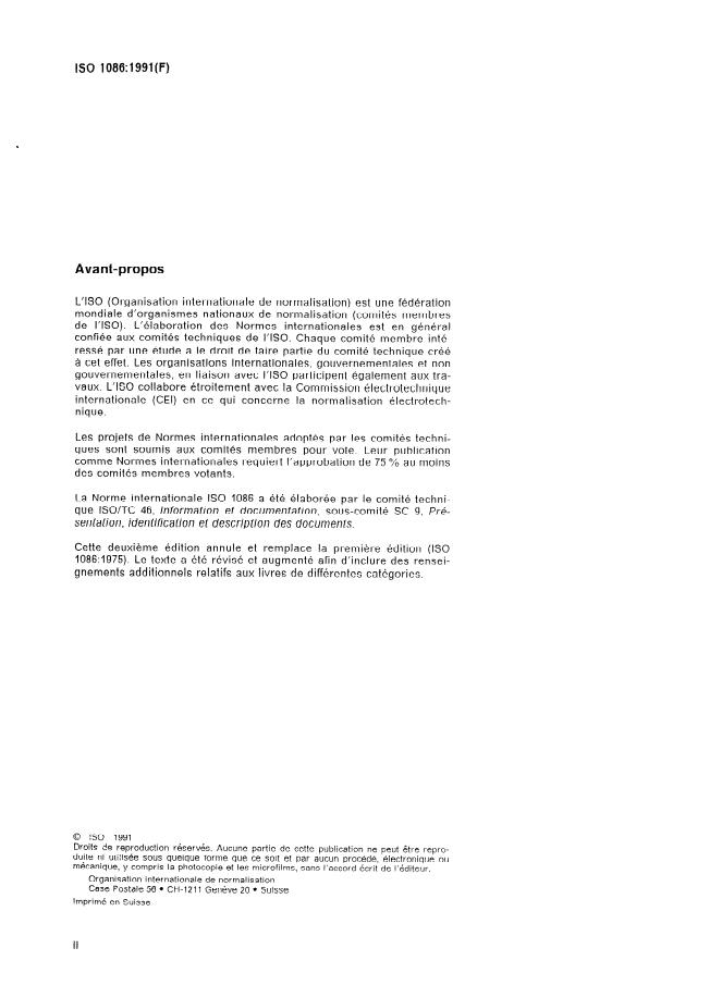 ISO 1086:1991 is an international standard developed by the International Organization for Standardization (ISO) that specifies the requirements for the information printed on the title leaves of books, including the presentation and arrangement of such information. This second edition revises and replaces the earlier 1975 edition to provide enhanced guidance applicable to a broader range of book types, including monographs, collectanea, atlases, theses, congress proceedings, and technical reports.