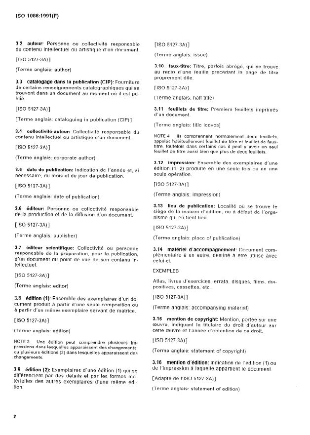 ISO 1086:1991 is a standard published by the International Organization for Standardization (ISO). Its full title is "Information and documentation - Title leaves of books". This standard covers: Specifies the information to be printed on title leaves and the manner in which this information should be presented and arranged. This second edition cancels and replaces the first edition (1975).
