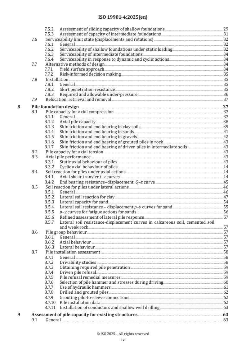 - Shallow & intermediate foundations: principles, embedment, acceptance criteria, bearing and sliding capacity, serviceability (displacements/rotations), installation and relocation (Clause 7).