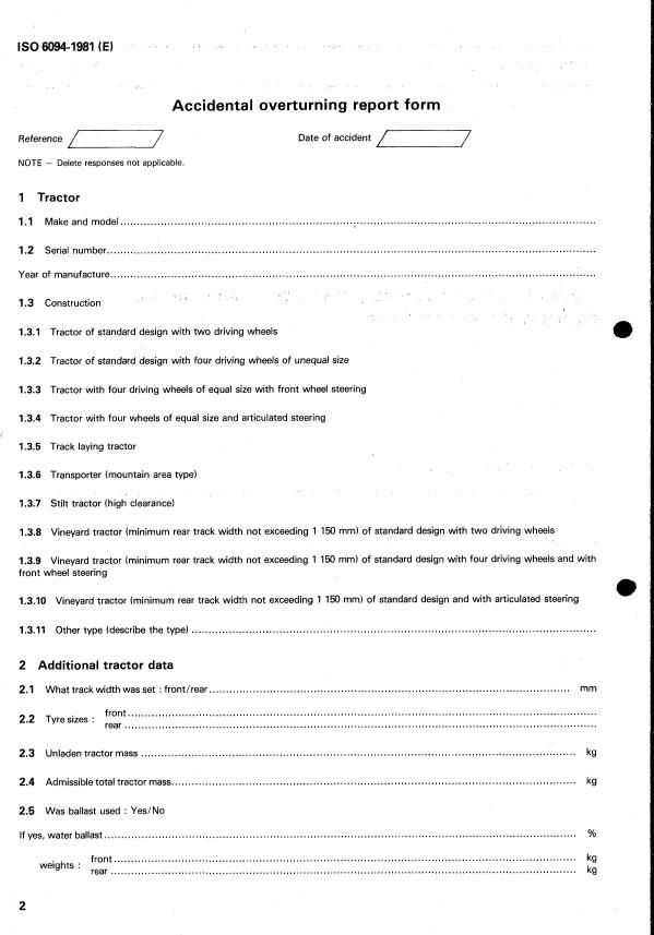 ISO 6094:1981 - Agricultural and forestry tractors -- Accidental overturning report form