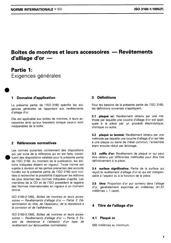 ISO 3160-1:1995 is a standard published by the International Organization for Standardization (ISO). Its full title is "Watch cases and accessories — Gold alloy coverings — Part 1: General requirements". This standard covers: Watch cases and accessories — Gold alloy coverings — Part 1: General requirements