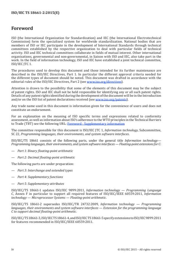 ISO/IEC/TS 18661-2:2015 extends programming language C as specified in ISO/IEC 9899:2011, (C11) with changes specified in ISO/IEC/TS 18661-1, to support decimal floating-point arithmetic conforming to ISO/IEC/IEEE 60559:2011. It covers all requirements of IEC 60559 as they pertain to C decimal floating types. ISO/IEC/TS 18661-2:2015 does not cover binary floating-point arithmetic (which is covered in ISO/IEC/TS 18661-1), nor does it cover most optional features of IEC 60559.