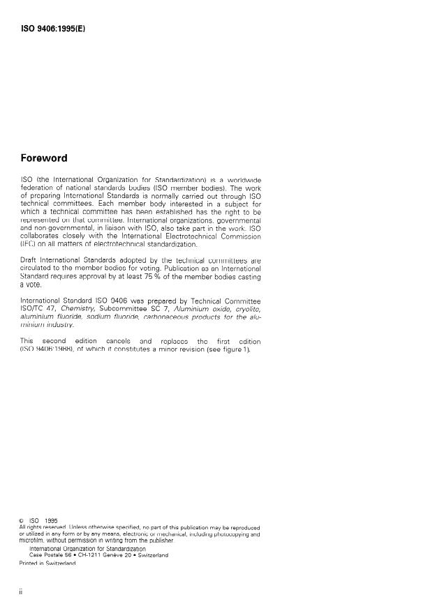 ISO 9406:1995 is a standard published by the International Organization for Standardization (ISO). Its full title is "Carbonaceous materials for the production of aluminium — Green coke — Determination of volatile matter content by gravimetric analysis". This standard covers: Cancels and replaces the first edition (1988). Specifies a method for the determination, by gravimetric analysis, of the volatile matter in green coke used in the production of aluminium. Applicable to green cokes having volatile matter contents greater than 1 % (m/m).