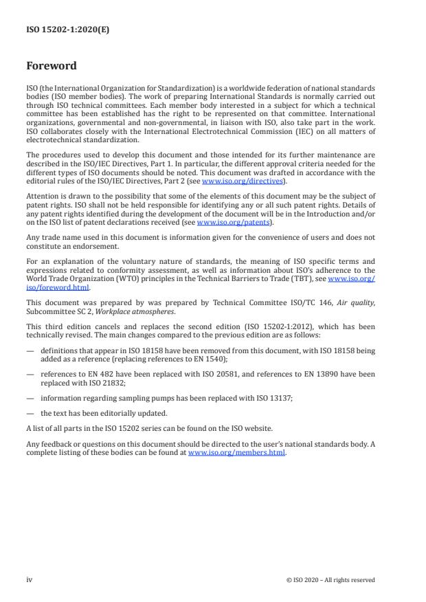 ISO 15202-1:2020 is a standard published by the International Organization for Standardization (ISO). Its full title is "Workplace air — Determination of metals and metalloids in airborne particulate matter by inductively coupled plasma atomic emission spectrometry — Part 1: Sampling". This standard covers: This document specifies a method for collecting samples of airborne particulate matter for subsequent determination of metals and metalloids using inductively coupled plasma — atomic emission spectrometry (ICP-AES). Samples obtained using the method described herein can also be subsequently analysed for elemental composition by other instrumental methods, such as atomic absorption spectrometry (AAS) or inductively coupled plasma mass spectrometry (ICP-MS). The method is not applicable to the sampling of mercury, which is present in air in the vapour phase at ambient temperatures; inorganic compounds of metals and metalloids that are permanent gases, e.g. arsine (AsH3); or inorganic compounds of metals and metalloids that are present in the vapour phase at ambient temperatures, e.g. arsenic trioxide (As2O3). NOTE Although the method does not describe a means of collecting inorganic compounds of metals and metalloids that are present in the vapour phase, in most instances this is relatively easily to achieve by using a back-up filter which has been pre-treated to trap the compound(s) of interest, e.g. a back-up paper pad impregnated with sodium carbonate is suitable for collecting arsenic trioxide (see ISO 11041[2]). The method is applicable to personal sampling of the inhalable, thoracic or respirable fraction of airborne particles, as defined in ISO 7708, and to static sampling. This document excludes sampling of surfaces or bulk materials. Guidance on collection of samples for surfaces may be found in ASTM D7659[7].