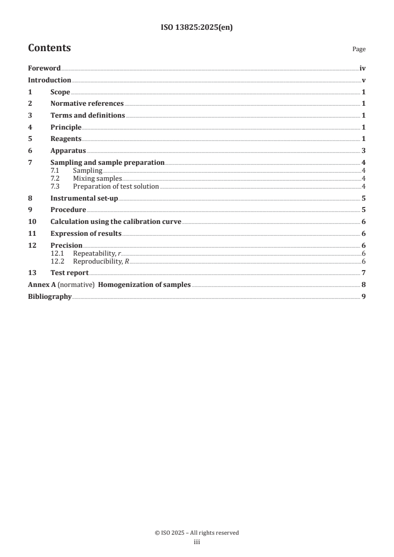 ISO 13825:2025 is a standard published by the International Organization for Standardization (ISO). Its full title is "Petroleum and related products - Determination of arsenic in crude petroleum using atomic fluorescence spectrometry". This standard covers: This document specifies a method for the determination of arsenic content in crude oil pretreated by a closed microwave digestion method by atomic fluorescence spectrometry. The precision statement of this test method was determined in an interlaboratory study and is valid for samples with an arsenic content between 0,35 mg/kg and 3,57 mg/kg. The test method can also be applied to samples with either a higher or lower arsenic content, however, no precision data has been determined at levels outside of this range.
