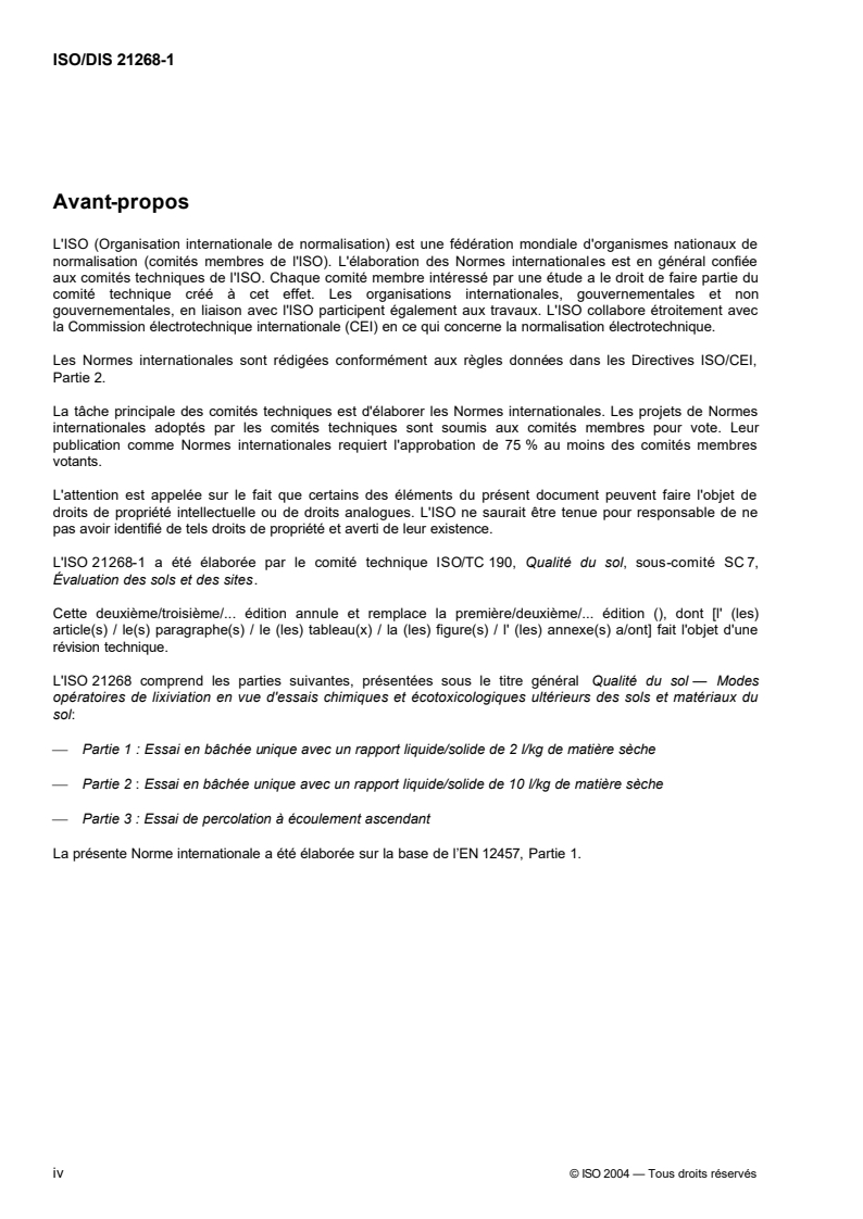 ISO/CD 21268-1 - Soil quality — Leaching procedures for subsequent chemical and ecotoxicological testing — Part 1: Batch test using a liquid to solid ratio of 2 l to 1 kg Released:6/16/2004