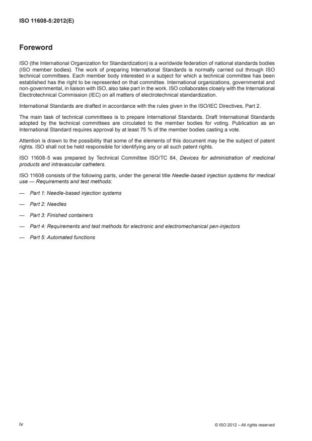 ISO 11608-5:2012 is a standard published by the International Organization for Standardization (ISO). Its full title is "Needle-based injection systems for medical use — Requirements and test methods — Part 5: Automated functions". This standard covers: ISO 11608-5:2012 specifies requirements and test methods for the automated functions of needle-based injection systems with automated functions (NIS-AUTO), for the administration of medicinal products in humans.