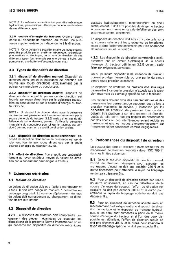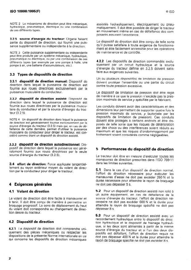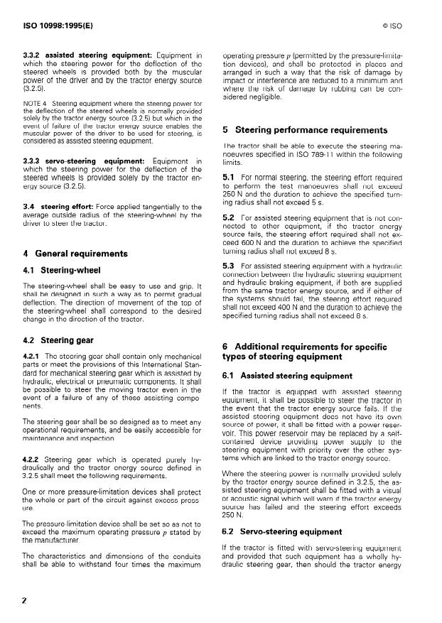 ISO 10998:1995 is a standard published by the International Organization for Standardization (ISO). Its full title is "Agricultural wheeled tractors — Steering requirements". This standard covers: Specifies performance requirements for normal and emergency steering modes for agricultural wheeled tractors having at least two axles fitted with pneumatic tyres. Does not apply to track-type or skid-steered agricultural tractors.
