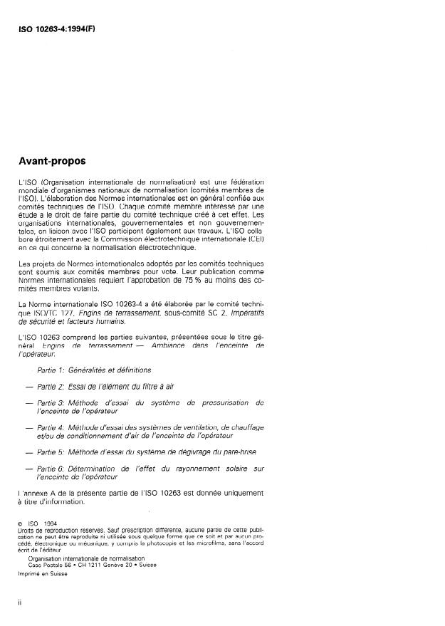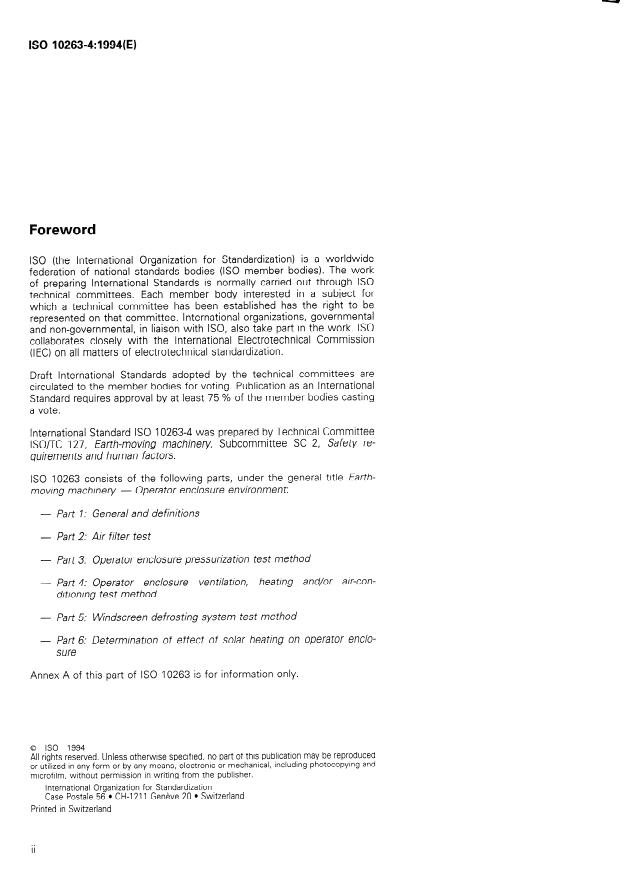 ISO 10263-4:1994 is a standard published by the International Organization for Standardization (ISO). Its full title is "Earth-moving machinery — Operator enclosure environment — Part 4: Operator enclosure ventilation, heating and/or air-conditioning test method". This standard covers: Specifies a test method which provides uniform measurement of the temperature and humidity inside an operator enclosure of an earth-moving machine equipped with devices for air-conditioning, heating and/or ventilation.