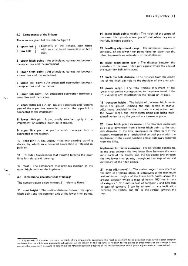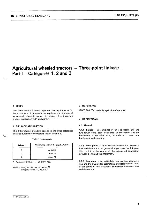 ISO 730-1:1977 is a standard published by the International Organization for Standardization (ISO). Its full title is "Agricultural wheeled tractors — Three-point linkage — Part 1: Categories 1, 2 and 3". This standard covers: Agricultural wheeled tractors — Three-point linkage — Part 1: Categories 1, 2 and 3