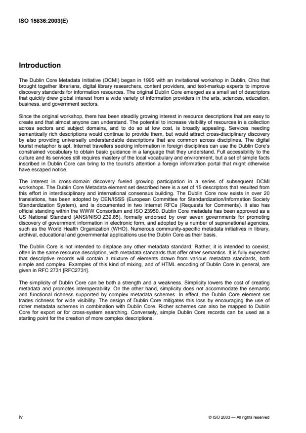 ISO 15836:2003 is applicable to the Dublin Core metadata element set which deals with cross-domain information resource description. For Dublin Core applications, a resource will typically be an electronic document. ISO 15836:2003 is for the element set only, which is generally used in the context of a specific project or application. Local or community based requirements and policies may impose additional restrictions, rules, and interpretations. It is not the purpose of ISO 15836:2003 to define the detailed criteria by which the element set will be used with specific projects and applications.