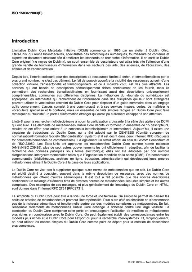 L'ISO 15836:2003 est applicable à l'ensemble des éléments de métadonnées Dublin Core qui traitent de description interdisciplinaire de ressources. Pour les applications du Dublin Core, une ressource est généralement un document électronique. L'ISO 15836:2003 ne porte que sur l'ensemble des éléments, qui est généralement utilisé dans le contexte d'un projet ou d'une application spécifiques. Des exigences ou politiques en besoins locaux ou communautaires peuvent imposer des restrictions, des règles et des interprétations supplémentaires. L'ISO 15836:2003 n'a pas pour objet de définir selon quels critères détaillés l'ensemble des éléments sera utilisé au sein de projets ou d'applications spécifiques.
