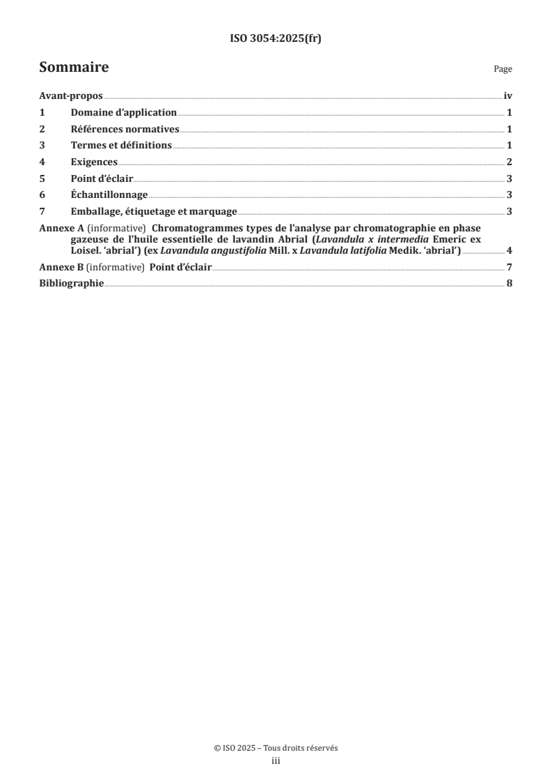 Keywords: ISO 3054:2025, lavandin Abrial essential oil, Lavandula x intermedia ‘abrial’, chromatographic profile, gas chromatography, essential oils quality, linalool, linalyl acetate, flash point, sampling, ISO essential oils standards.