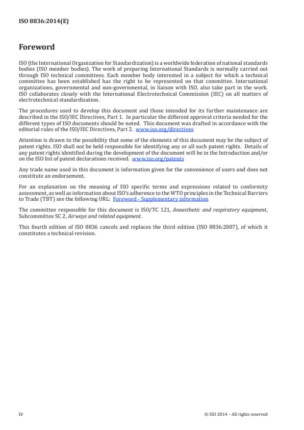 ISO 8836:2014 is a standard published by the International Organization for Standardization (ISO). Its full title is "Suction catheters for use in the respiratory tract". This standard covers: ISO 8836:2014 specifies requirements for suction catheters, including closed suction catheters, made of flexible materials and intended for use in suctioning of the respiratory tract. Angled-tip suction catheters (e.g. Coudé catheters) and suction catheters with aspirator collectors are not considered to be specialized and are therefore included in the scope of ISO 8836:2014.
