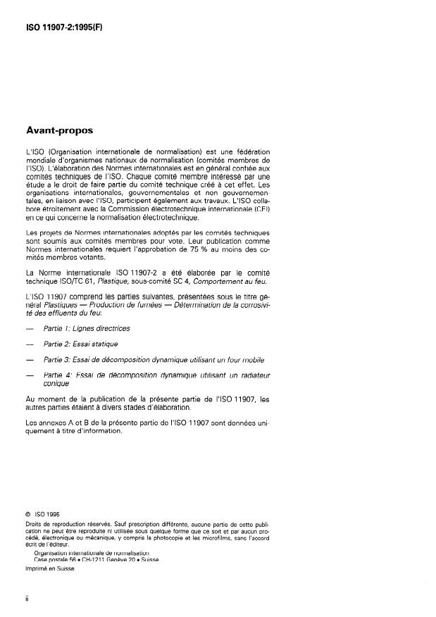 ISO 11907-2:1995 - Plastiques -- Production de fumées -- Détermination de la corrosivité des effluents du feu