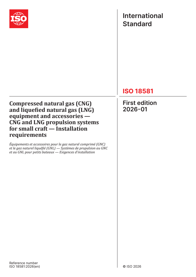 ISO 18581:2026 is a standard published by the International Organization for Standardization (ISO). Its full title is "Compressed natural gas (CNG) and liquefied natural gas (LNG) equipment and accessories — CNG and LNG propulsion systems for small craft — Installation requirements". This standard covers: This document specifies the requirements for the installation of compressed natural gas (CNG) and liquefied natural gas (LNG) propulsion systems and components on small crafts. This document does not cover appliances with directly attached gas cylinders, such as portable container.