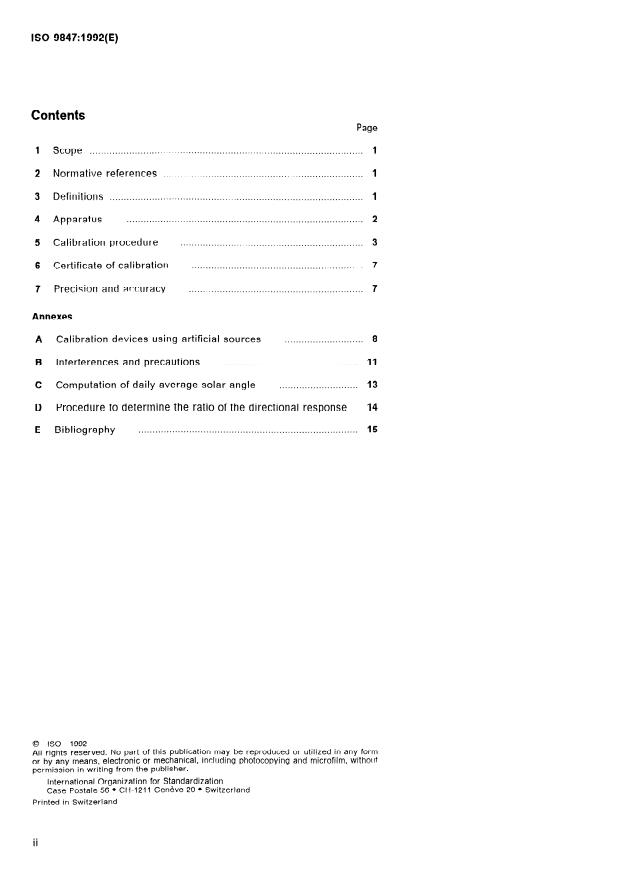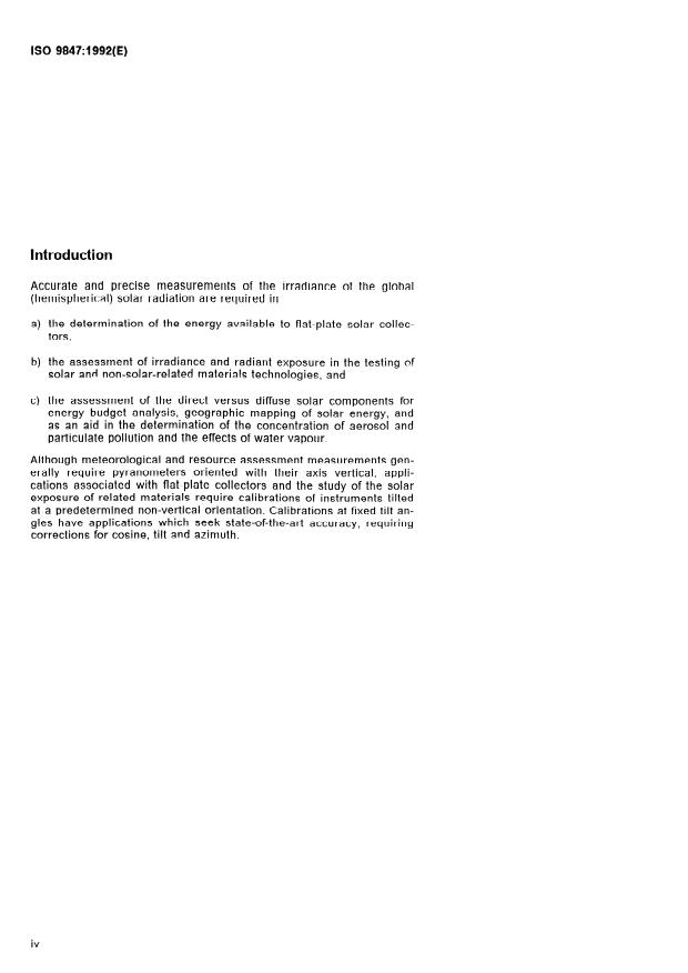 ISO 9847:1992 is a standard published by the International Organization for Standardization (ISO). Its full title is "Solar energy — Calibration of field pyranometers by comparison to a reference pyranometer". This standard covers: Specifies two preferred methods: the outdoor calibration (with the pyranometer in a horizontal position, in a tilted position, or at normal incidence) and the indoor calibration (using an integrating sphere with shaded or unshaded lamp, or at normal incidence). Applicable to most types of field pyranometers regardless of the type of radiation receptor employed.