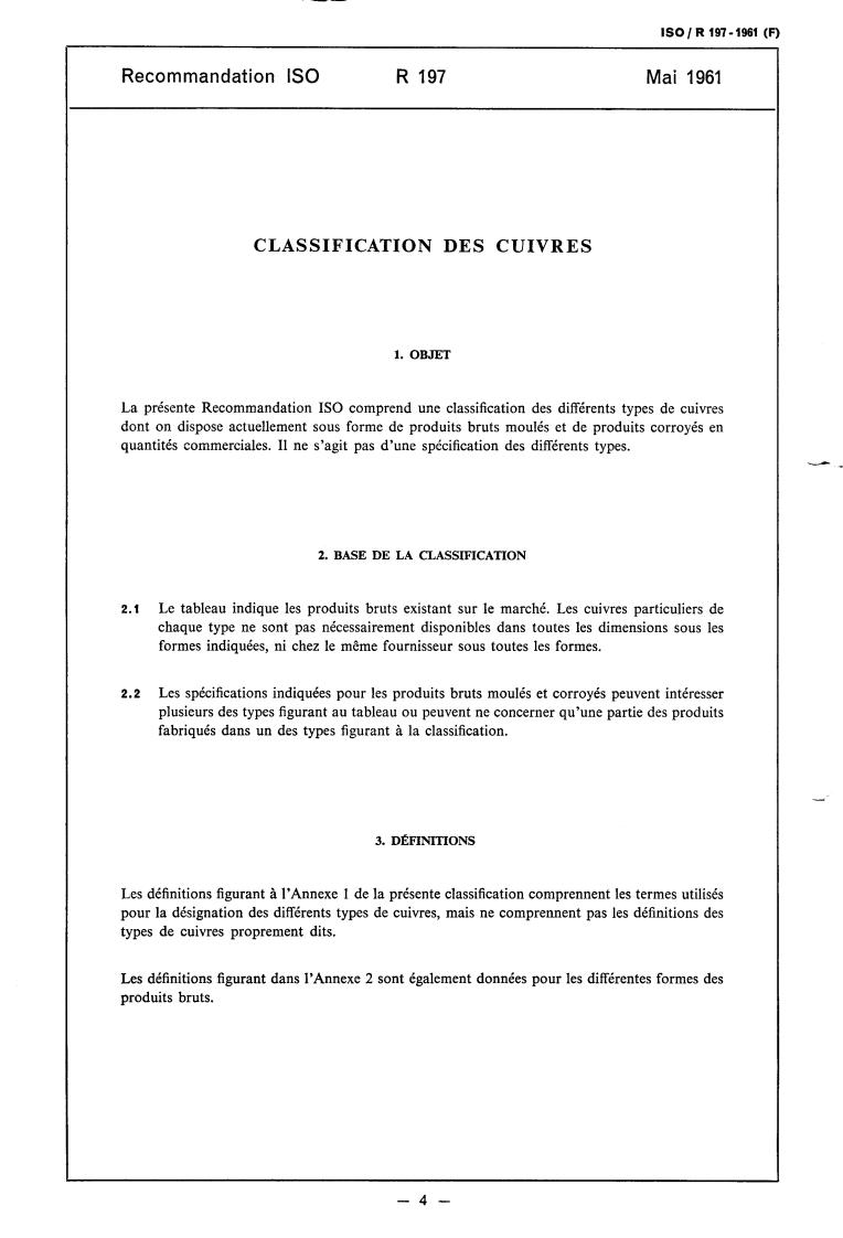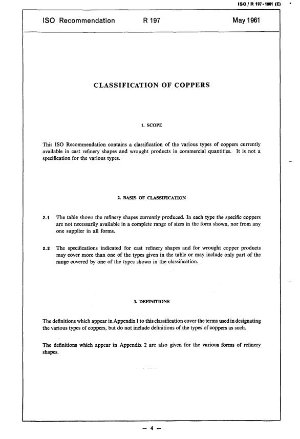 ISO/R 197:1961 is a standard published by the International Organization for Standardization (ISO). Its full title is "Classification of coppers". This standard covers: Classification of coppers