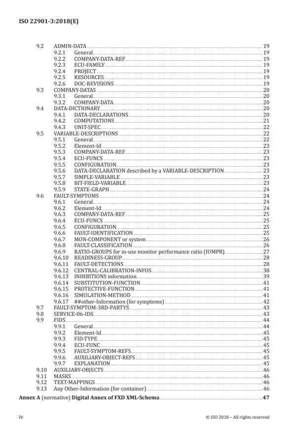 ISO 22901-3:2018 is a standard published by the International Organization for Standardization (ISO). Its full title is "Road vehicles - Open diagnostic data exchange (ODX) - Part 3: Fault symptom exchange description (FXD)". This standard covers: ISO 22901-3:2018 specifies machine-readable descriptions of all fault symptom algorithms which are implemented as diagnostic software in an electronic control unit (ECU). The main use case is the standardized data exchange from a function & software supplier to a vehicle manufacturer (VM) in order to enable a tool-based information processing. Based on the FXD content and associated calibration values, several end user documents can be generated such as the "summary sheet" needed as part of the vehicle type approval documentation package or the "repair and maintenance information" (RMI). The expected main benefits of the FXD approach are an overall efficiency improvement as well as an independency of supplier- and VM-specific format handling.