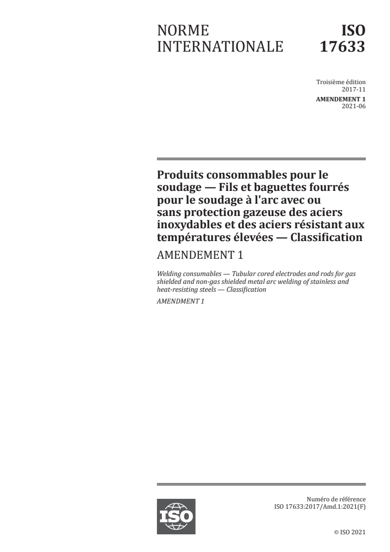 ISO 17633:2017/Amd 1:2021 - Produits consommables pour le soudage — Fils et baguettes fourrés pour le soudage à l'arc avec ou sans protection gazeuse des aciers inoxydables et des aciers résistant aux températures élevées — Classification — Amendement 1 Released:6/8/2021
