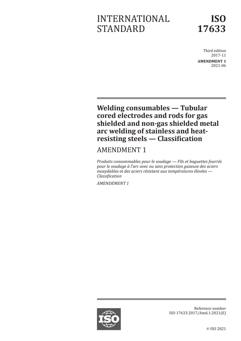 ISO 17633:2017/Amd 1:2021 - Welding consumables — Tubular cored electrodes and rods for gas shielded and non-gas shielded metal arc welding of stainless and heat-resisting steels — Classification — Amendment 1 Released:6/8/2021