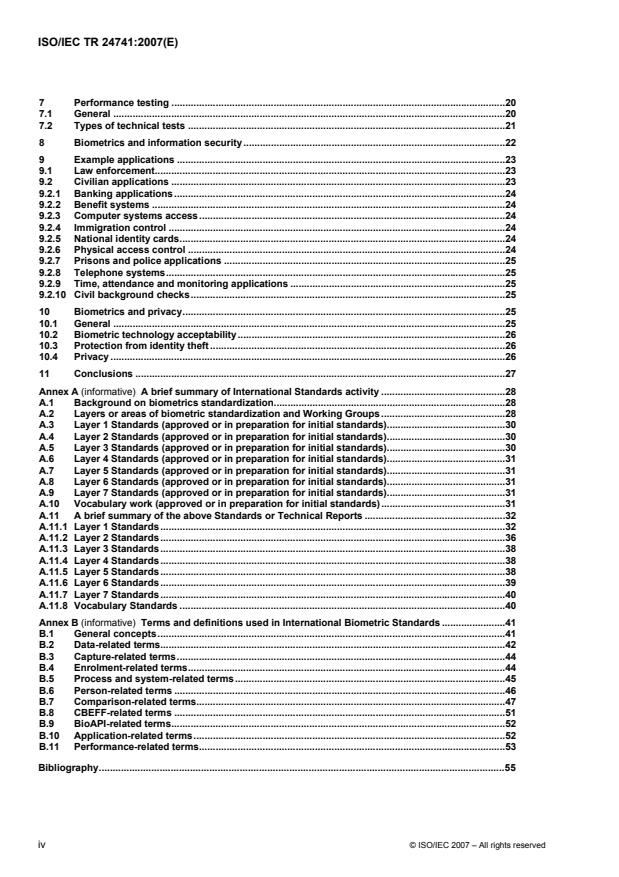 ISO/IEC TR 24741:2007 describes the main biometric technologies, with some historical information. An annex describes the work of creating International Standards for biometrics and provides a layered model for the placement of the various International Standards being produced, with a short description of each. A second annex contains some of the terms and definitions currently used in these International Standards or the drafts of these International Standards.