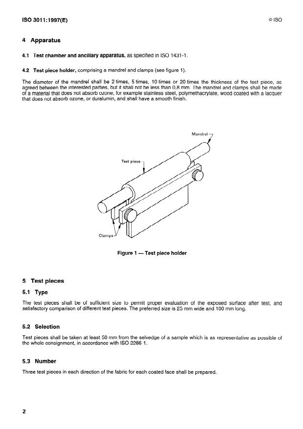 ISO 3011:1997 is a standard published by the International Organization for Standardization (ISO). Its full title is "Rubber- or plastics-coated fabrics — Determination of resistance to ozone cracking under static conditions". This standard covers: Rubber- or plastics-coated fabrics — Determination of resistance to ozone cracking under static conditions