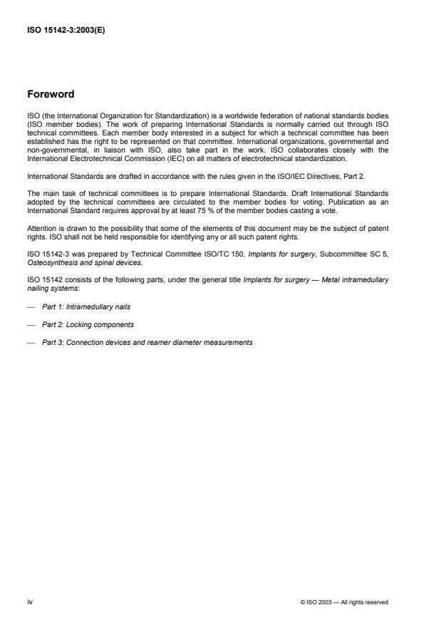ISO 15142-3:2003 is a standard published by the International Organization for Standardization (ISO). Its full title is "Implants for surgery - Metal intramedullary nailing systems - Part 3: Connection devices and reamer diameter measurements". This standard covers: ISO 15142-3:2003 specifies metallic medical devices used for the temporary intramedullary stabilization of long bones by surgical implantation, classifying and giving other requirements and dimensions for the devices used to insert, remove or both insert and remove intramedullary nails. It also provides a means of measuring reamer diameter. It is applicable to all metal intramedullary fixation devices used for temporary fixation of long bones in the human body, except drive connections for locking elements.