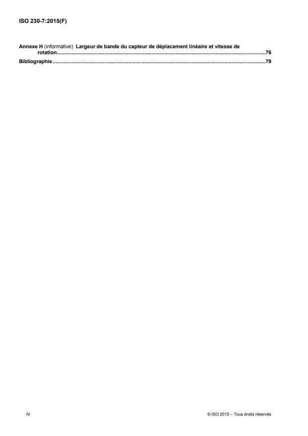L'ISO 230-7:2015 a pour but de normaliser les méthodes de spécification et d'essai de l'exactitude géométrique des axes de rotation utilisés sur les machines-outils. Les porte-broches, têtes rotatives et tables rotatives et pivotantes des machines-outils constituent les axes de rotation, qui ont tous des mouvements non attendus dans l'espace, résultant de sources d'erreurs multiples. L'ISO 230-7:2015 couvre les propriétés suivantes des axes rotatifs : erreurs de mouvements des axes de rotation ; déplacements d'axes induits par la vitesse. Les autres propriétés importantes des axes rotatifs, telles que les déplacements d'axes induits thermiquement et les déplacements d'axes induits par des variations de température ambiante, sont décrites dans l'ISO 230‑3. L'ISO 230-7:2015 ne couvre pas les propriétés suivantes des broches : l'exactitude du positionnement angulaire (voir l'ISO 230‑1 et l'ISO 230-2) ; le battement des surfaces et des composants (voir l'ISO 230‑1) ; les spécifications des porte-outils ; les mesures inertielles de vibrations (voir l'ISO/TR 230‑8) ; les mesures de bruit (voir l'ISO 230‑5) ; l'amplitude et l'exactitude des vitesses de rotation (voir l'ISO 10791‑6 et l'ISO 13041-6) ; les mesures ou les méthodes d'équilibrage (voir l'ISO 1940‑1 et l'ISO 6103) ; les pertes en marche à vide (perte de puissance) ; les effets thermiques (voir l'ISO 230‑3).