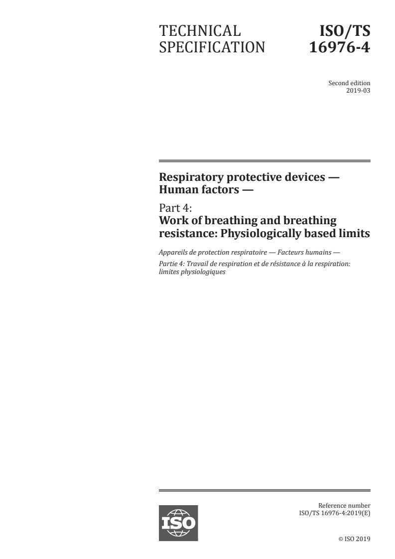 ISO/TS 16976-4:2019 - Respiratory protective devices — Human factors — Part 4: Work of breathing and breathing resistance: Physiologically based limits Released:3/29/2019