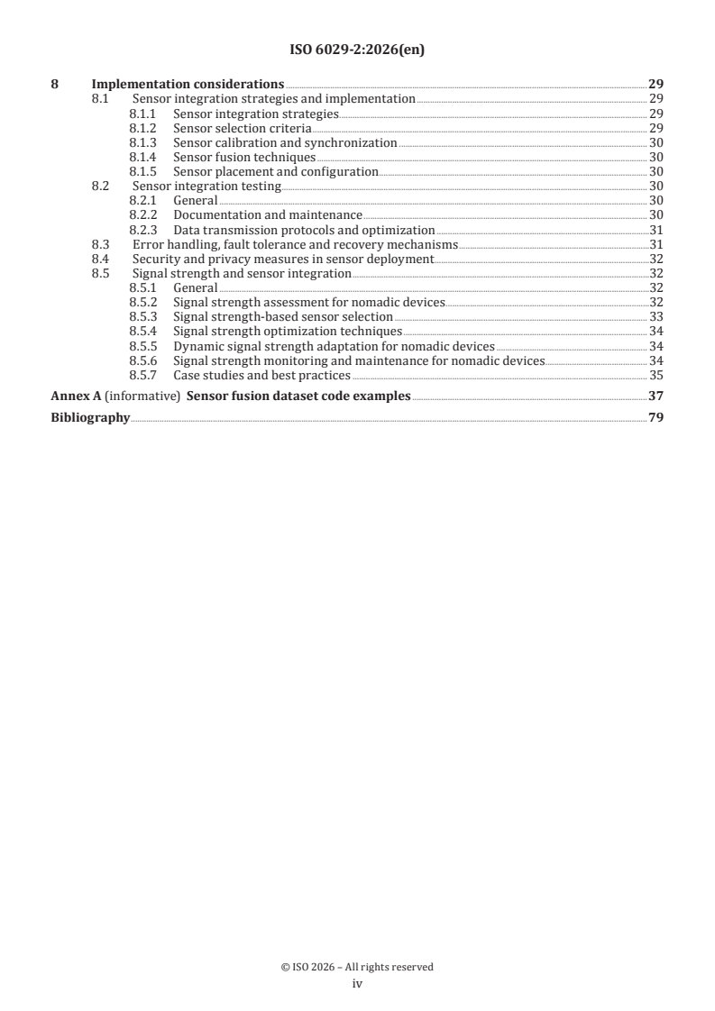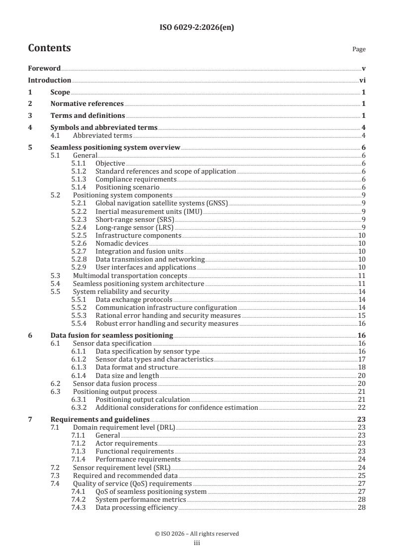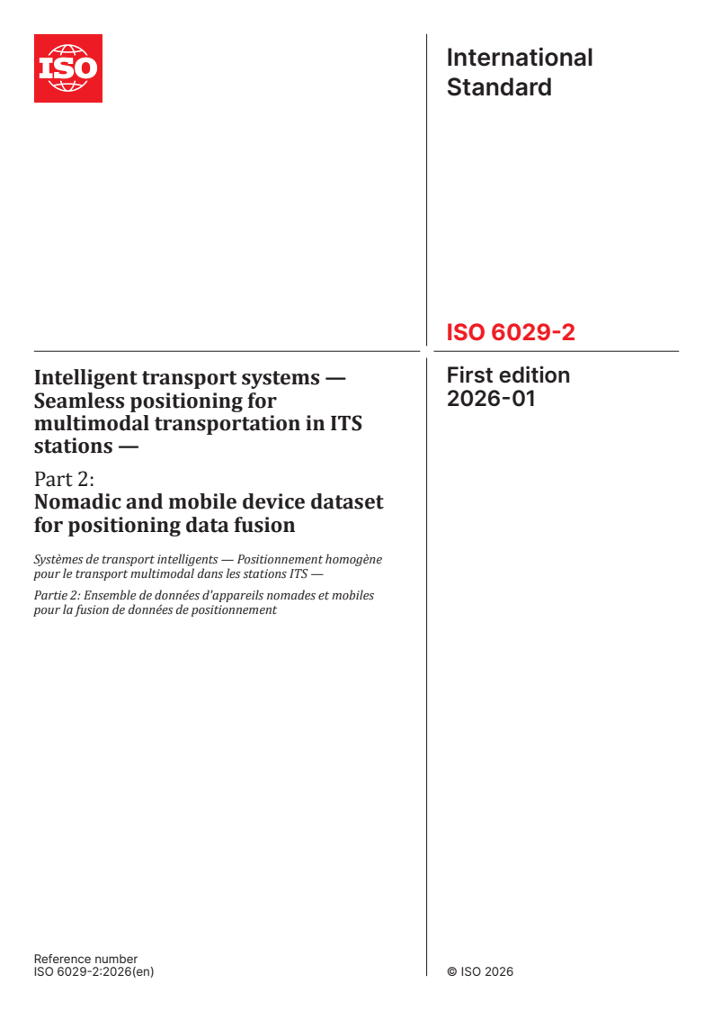 ISO 6029-2:2026 is a standard published by the International Organization for Standardization (ISO). Its full title is "Intelligent transport systems — Seamless positioning for multimodal transportation in ITS stations — Part 2: Nomadic and mobile device dataset for positioning data fusion". This standard covers: This document specifies the sensor data fusion applicable to the use cases of indoor and outdoor seamless positioning solutions for a mobile user (multimodal transportation) in intelligent transport system (ITS) stations. This document provides technical requirements for data fusion between three domains: nomadic device [e.g. personal intelligent transport system station (P-ITS-S)], mobility [e.g. vehicle intelligent transport system station (V-ITS-S)], and infrastructure [e.g. roadside intelligent transport system station (R-ITS-S)]. The data exchange between these domains is based on a standardized message and data format and this document identifies use cases for each different case of communication between domains.