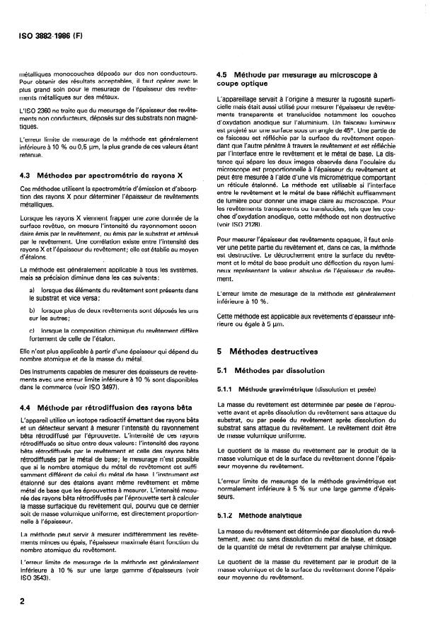 ISO 3882:1986 is a standard published by the International Organization for Standardization (ISO). Its full title is "Metallic and other non-organic coatings — Review of methods of measurement of thickness". This standard covers: This second edition cancels and replaces the first edition (i. e. ISO 3882:1978). Applies to both metallic and non-metallic substrates. It is limited to tests already specified, or to be specified, in International Standards, and excludes certain tests which are employed for special applications. Includes five non-destructive methods and four destructive methods.
