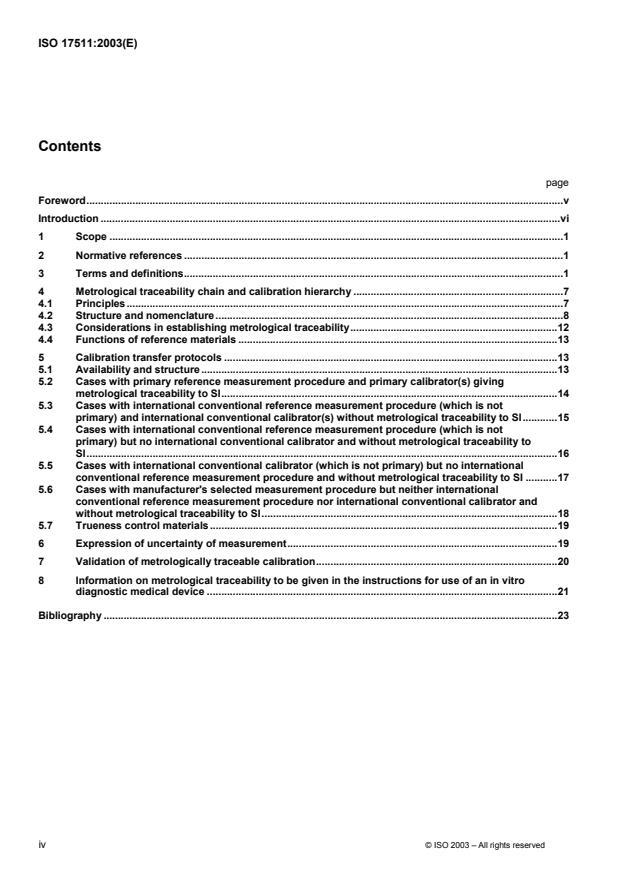 ISO 17511:2003 specifies how to assure the metrological traceability of values assigned to calibrators and control materials intended to establish or verify trueness of measurement. The calibrators and control materials are those provided by the manufacturers as part of, or to be used together with, in vitro diagnostic medical devices. External quality assessment (survey) samples, with proven commutability, whose values have been assigned by means of internationally agreed reference measurement systems or internationally agreed conventional reference measurement systems fall within the scope of ISO 17511:2003. ISO 17511:2003 is not applicable to control materials that do not have an assigned value and are used only for assessing the precision of a measurement procedure, either its repeatability or reproducibility (precision control materials); control materials intended for intralaboratory quality control purposes and supplied with intervals of suggested acceptable values, each interval obtained by interlaboratory consensus with respect to one specified measurement procedure, and with limiting values that are not metrologically traceable; correlation between results of two measurement procedures at the same metrological level, purporting to measure the same quantity, because such "horizontal" correlation does not provide metrological traceability; calibration derived from correlation between the results of two measurement procedures at different metrological levels, but with quantities having analytes of different characteristics; metrological traceability of routine results to the product calibrator and their relations to any medical discrimination limit; and properties involving nominal scales, i.e. where no magnitude is involved (e.g. identification of blood cells).