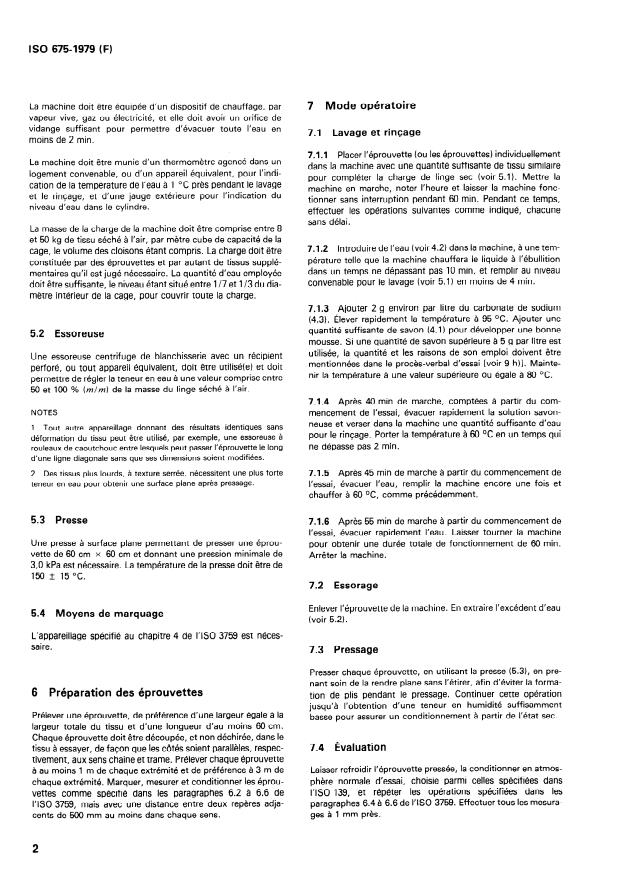 ISO 675:1979 is a standard published by the International Organization for Standardization (ISO). Its full title is "Textiles — Woven fabrics — Determination of dimensional change on commercial laundering near the boiling point". This standard covers: The method is only intended for the assessment of dimensional changes undergone by a woven fabric subjected to a single laundering. Washing of a specimen in a cylindrical reversing laundry machine under specified conditions. Extraction of excess water and pressing without preliminary drying. Measurement, before and after laundering, of distances marked on the specimen in the warp and weft directions. Detergent, water, wash wheel, extractor, pressing equipment, and marking equipment for the woven fabric are specified.