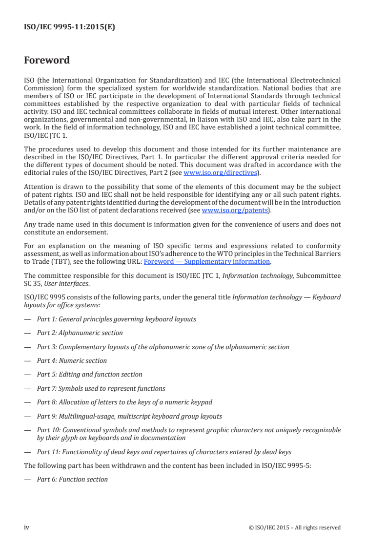 ISO/IEC 9995-11:2015 is a standard published by the International Organization for Standardization (ISO). Its full title is "Information technology - Keyboard layouts for office systems - Part 11: Functionality of dead keys and repertoires of characters entered by dead keys". This standard covers: Within the general scope described in ISO/IEC 9995‑1, ISO/IEC 9995-11:2015 defines the functionality of dead keys and repertoires of characters entered by dead keys (see Clause 5). ISO/IEC 9995-11:2015 is primarily intended for word-processing and text-processing applications.