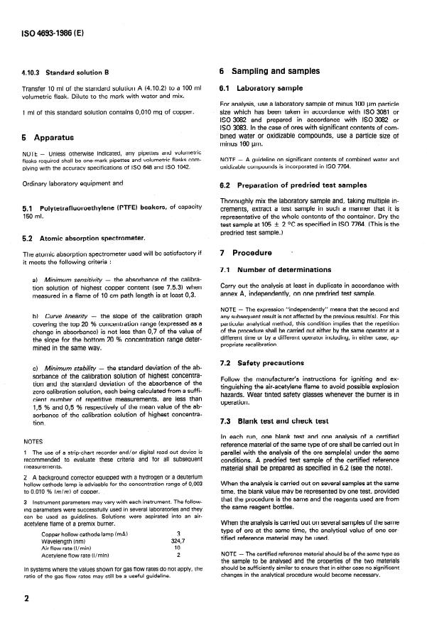 ISO 4693:1986 is a standard published by the International Organization for Standardization (ISO). Its full title is "Iron ores — Determination of copper content — Flame atomic absorption spectrometric method". This standard covers: The method ist applicable to a concentration range of 0,003 to 1,0 % (m/m) of copper in natural iron ores, and iron ore concentrates and agglomerates including sinter products. Specifies principle, reagents, apparatus, sampling and samples, procedure, expression of results, and test report. ISO 4693 includes three annexes.