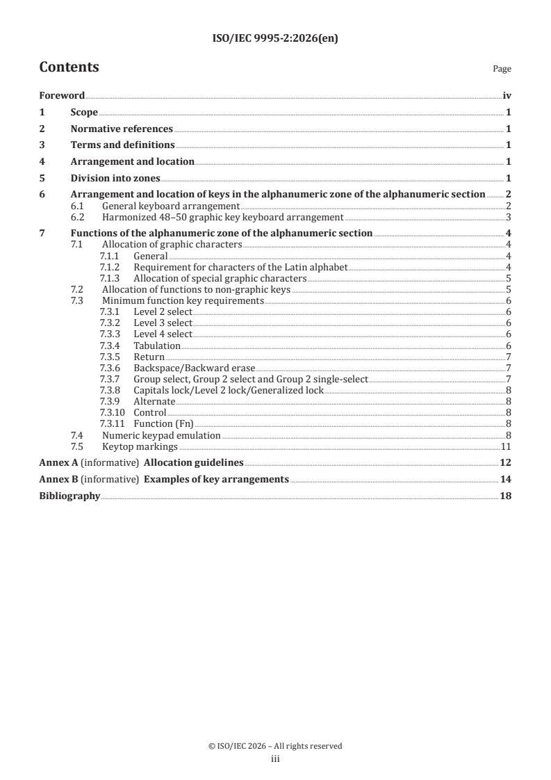 ISO/IEC 9995-2:2025 is an international standard developed by ISO/IEC Joint Technical Committee JTC 1/SC 35, focusing on the alphanumeric section of keyboards designed for text and office systems. This standard specifies the layout, arrangement, and functional allocation of keys within the alphanumeric section to support a unified and predictable user interface across diverse keyboard designs. It defines the division of the alphanumeric section into zones, the positioning and number of keys-particularly within the alphanumeric zone ZA0-and guidelines for allocating graphic and control functions to the keys. This part is essential for harmonizing keyboard layouts internationally, accommodating national variations, and enabling consistent interoperability for information technology devices.