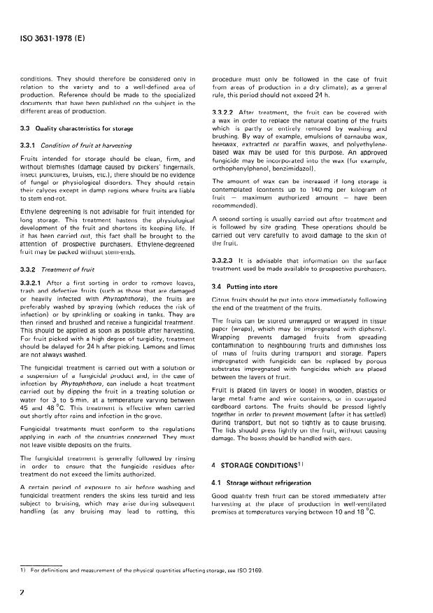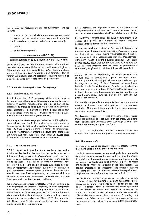 ISO 3631:1978 is a standard published by the International Organization for Standardization (ISO). Its full title is "Citrus fruits — Guide to storage". This standard covers: The guidance specifies conditions required for good keeping of oranges, mandarins, lemons, grapefruits and limes with or without refrigeration. It includes conditions of harvesting and putting into store, and optimum conditions, such as temperature, relative humidity, air circulation and fresh air change. A table gives recommended temperatures according to varieties and areas of production. Detailed information concerning cultivars is given in annexes A and B. Annex C shows sources of damage.