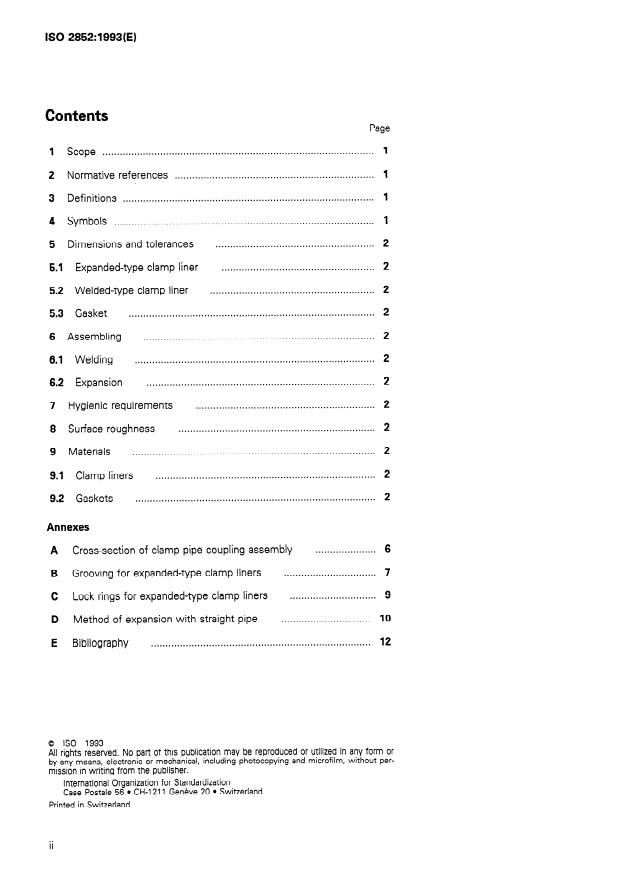 ISO 2852:1993 is a standard published by the International Organization for Standardization (ISO). Its full title is "Stainless steel clamp pipe couplings for the food industry". This standard covers: Specifies the dimensions, tolerances, surface roughness, materials, assembling and hygienic requirements for liners and gaskets. The clamps are not standardized but suitable clearances are specified in annex A. Male parts and liners are intended to be used with stainless steel tubes specified in ISO 2037.