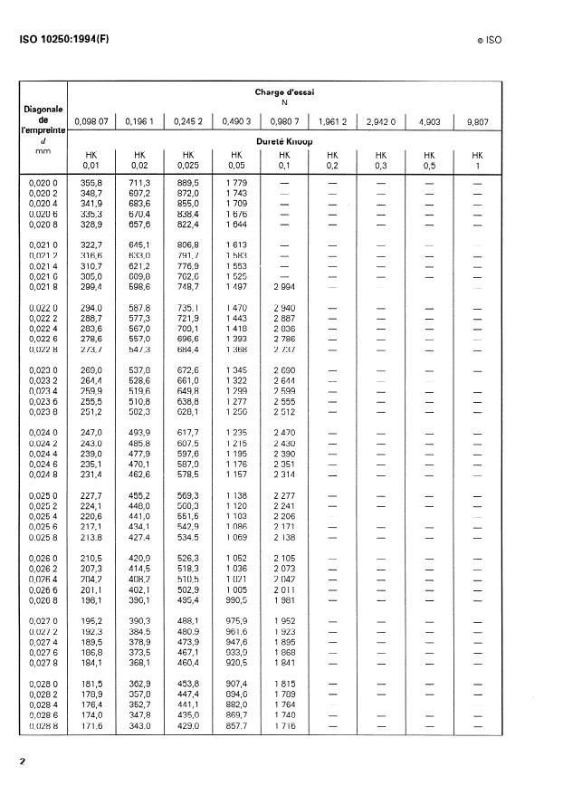 ISO 10250:1994 - Matériaux métalliques -- Essai de dureté -- Tableaux des valeurs de dureté Knoop pour utilisation dans les essais effectués sur surfaces planes