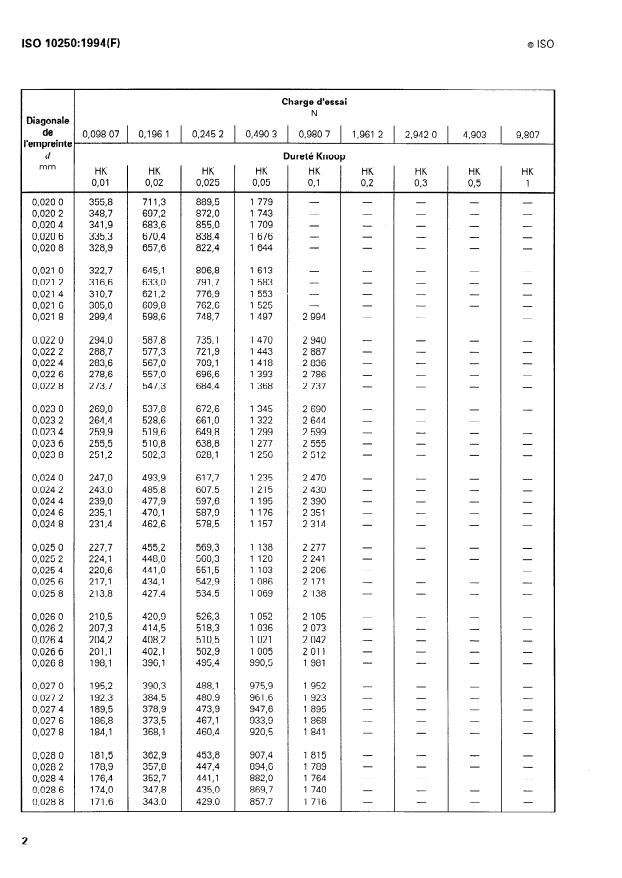 ISO 10250:1994 is a standard published by the International Organization for Standardization (ISO). Its full title is "Metallic materials — Hardness testing — Tables of Knoop hardness values for use in tests made on flat surfaces". This standard covers: Gives a table for calculation of Knoop hardness values for use in tests carried out in accordance with ISO 4545.