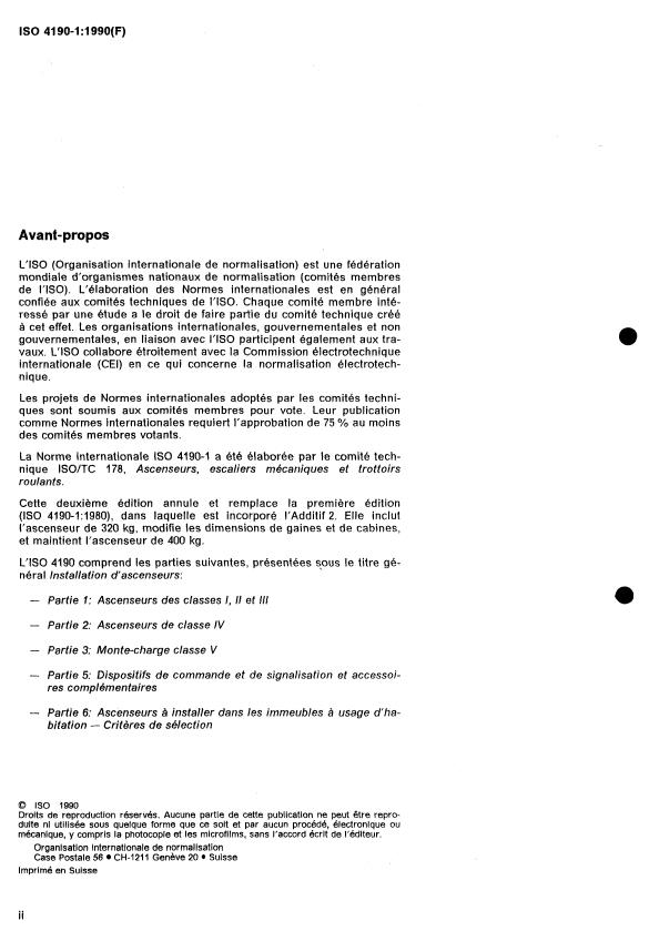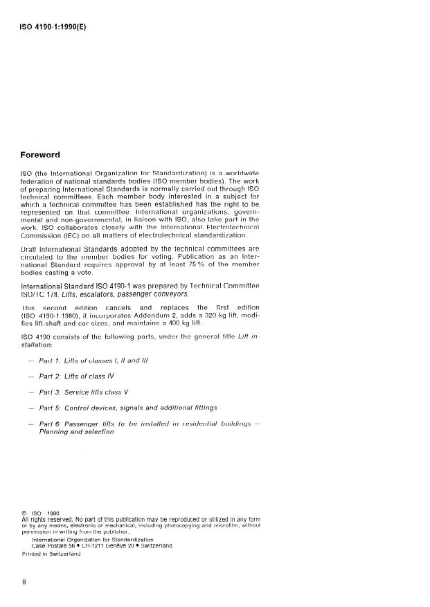 ISO 4190-1:1990 is a standard published by the International Organization for Standardization (ISO). Its full title is "Lift installation — Part 1: Lifts of classes I, II and III". This standard covers: Lift installation — Part 1: Lifts of classes I, II and III