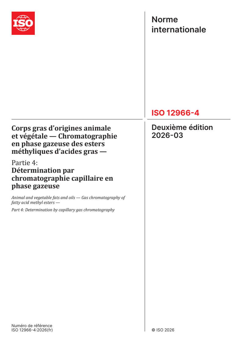 ISO 12966-4:2026 - Corps gras d’origines animale et végétale — Chromatographie en phase gazeuse des esters méthyliques d’acides gras — Partie 4: Détermination par chromatographie capillaire en phase gazeuse