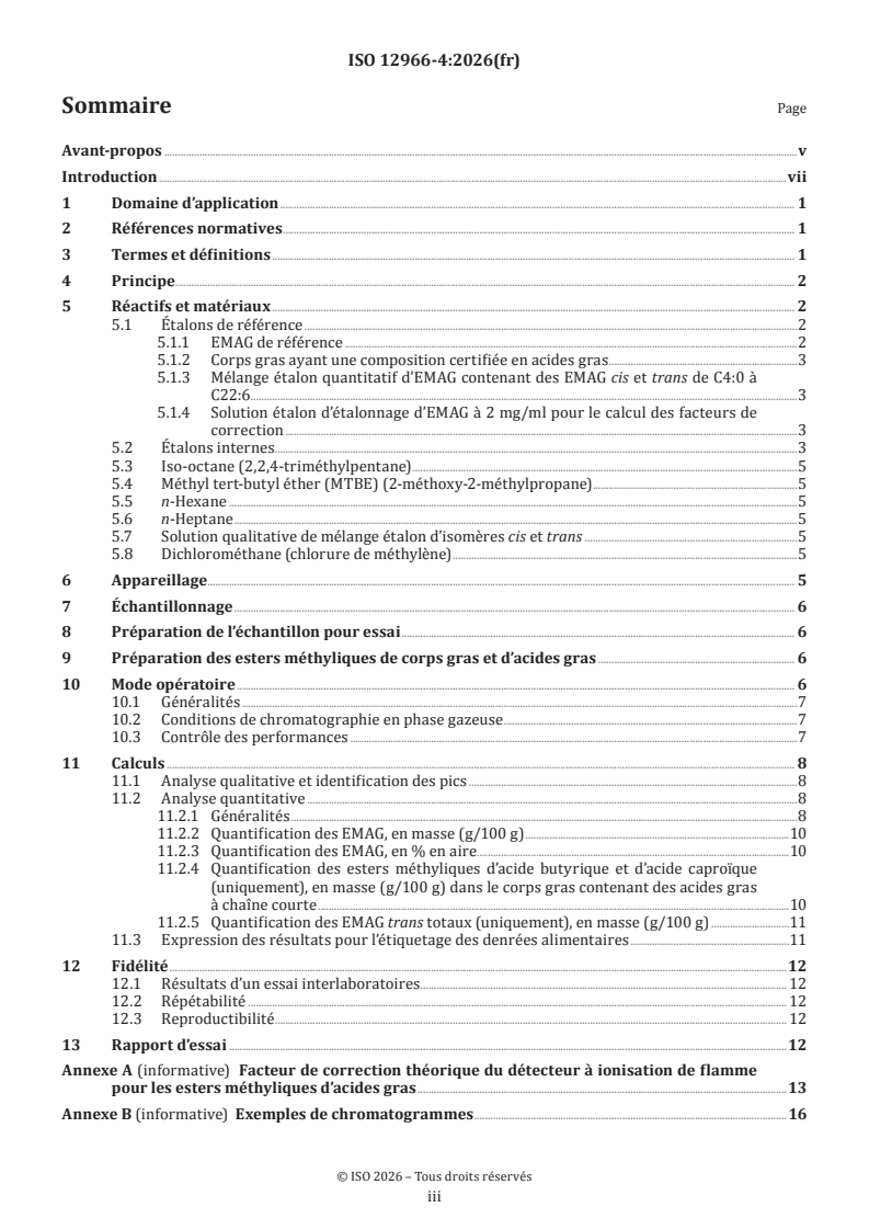 ISO 12966-4:2026 is a standard published by the International Organization for Standardization (ISO). Its full title is "Animal and vegetable fats and oils — Gas chromatography of fatty acid methyl esters — Part 4: Determination by capillary gas chromatography". This standard covers: This document specifies a method for the determination of fatty acid methyl esters (FAMEs) derived by transesterification or esterification from fats, oils, and fatty acids by capillary gas chromatography (GLC). FAMEs from C4 to C24 can be separated using this document including saturated FAMEs, cis- and trans-monounsaturated FAMEs, and cis- and trans-polyunsaturated FAMEs. This document is applicable to crude, refined, partially hydrogenated or fully hydrogenated fats, oils and fatty acids derived from animal and vegetable sources, and fats extracted from foodstuff. This document does not apply to milk and milk products (or fat coming from milk and milk products) or products supplemented with conjugated linoleic acid (CLA). This document does not apply to di-, tri-, polymerized, hydroxylated and oxidized fatty acids, and fats and oils. A method for the determination of the composition of FAMEs expressed by area % in liquid vegetable oils is proposed in Annex E.