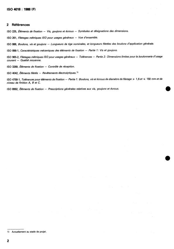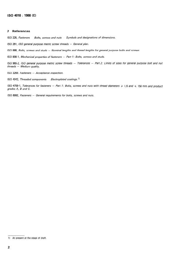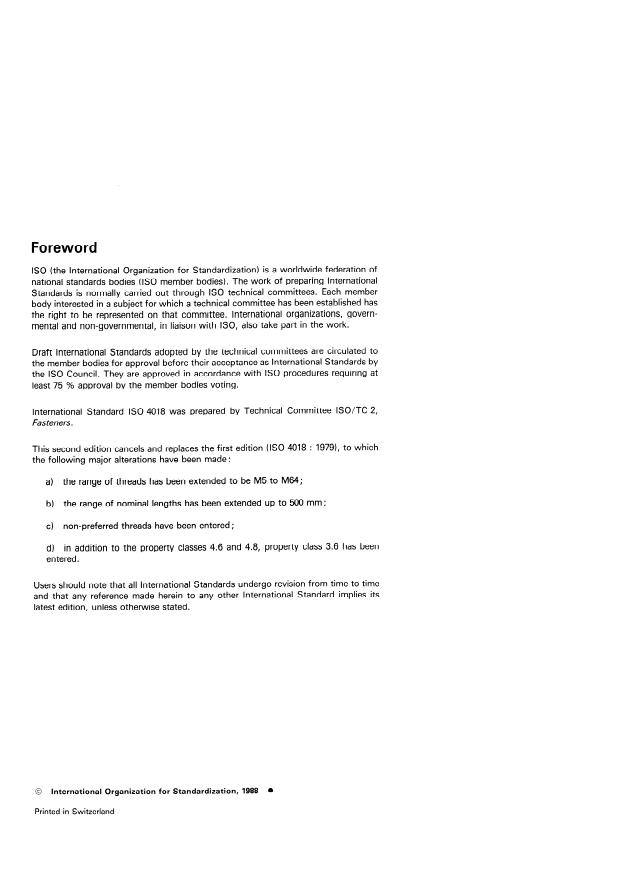 ISO 4018:1988 is a standard published by the International Organization for Standardization (ISO). Its full title is "Hexagon head screws — Product grade C". This standard covers: Hexagon head screws — Product grade C