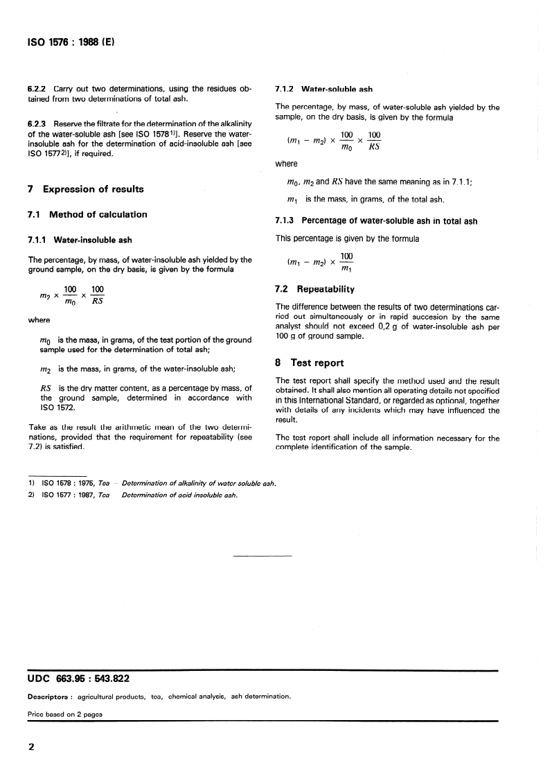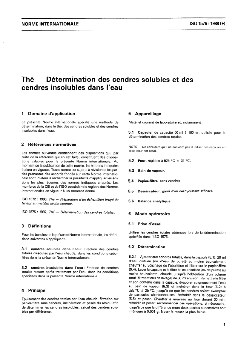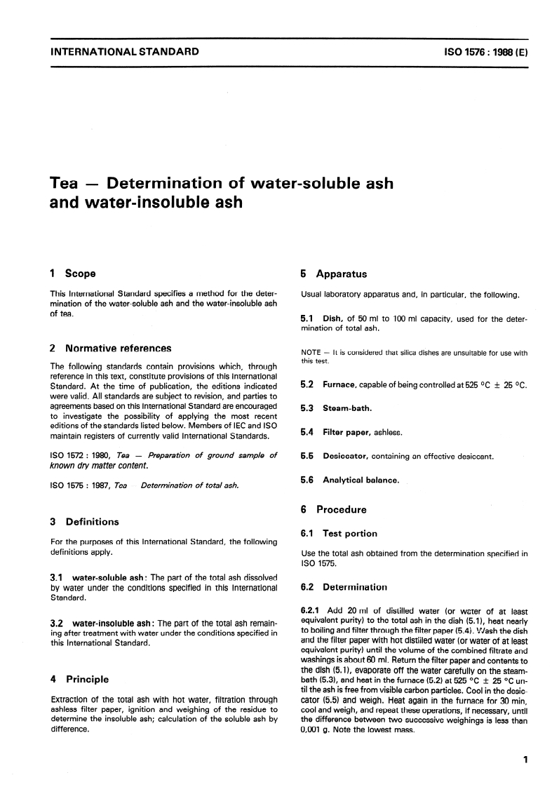ISO 1576:1988 - Tea — Determination of water-soluble ash and water-insoluble ash/7/1988