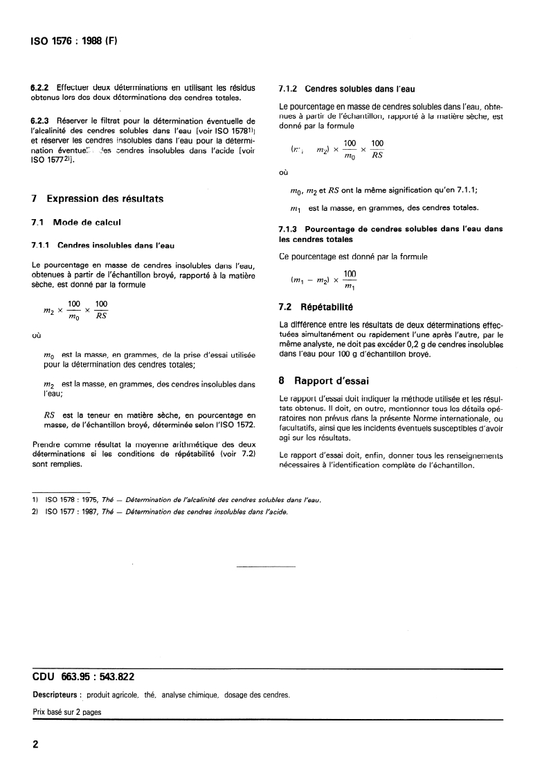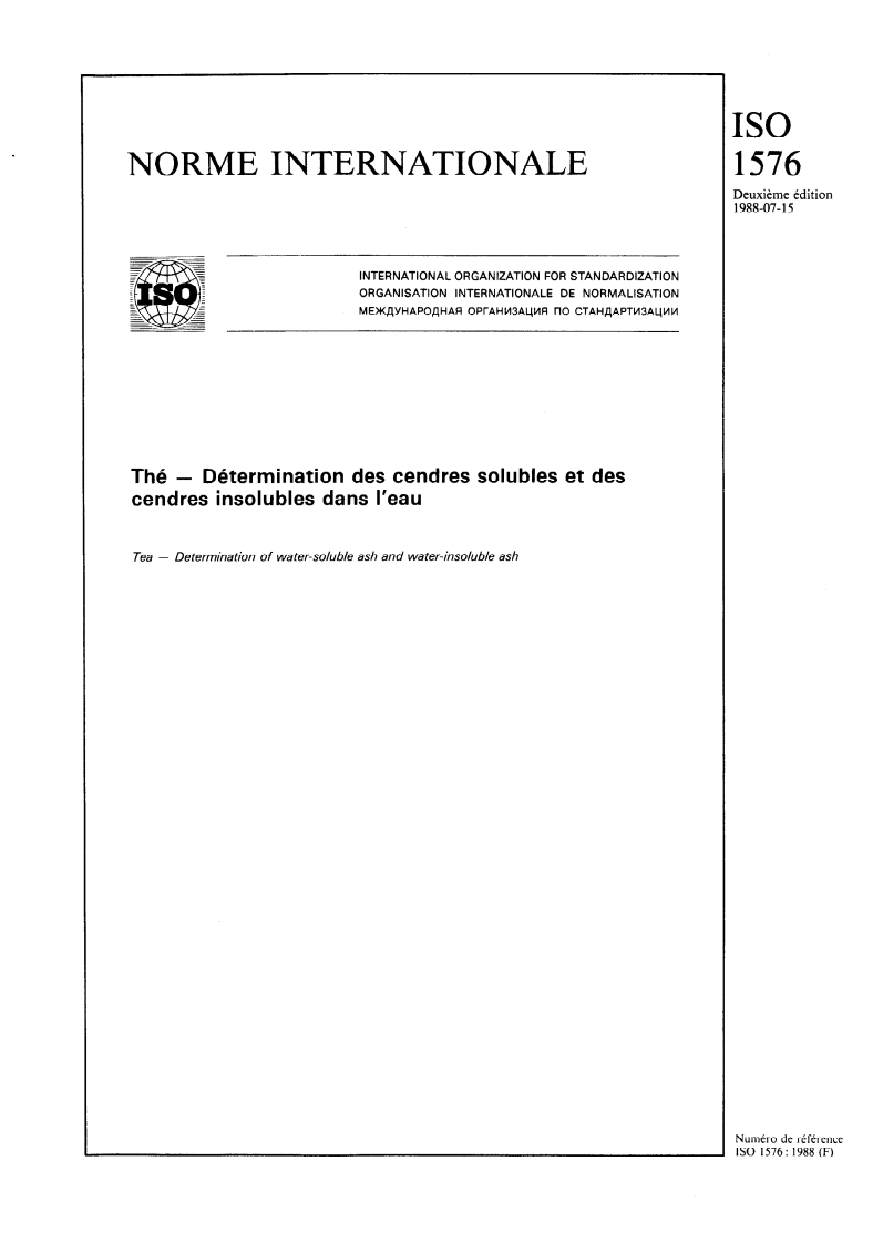 ISO 1576:1988 - Thé — Détermination des cendres solubles et des cendres insolubles dans l'eau/7/1988