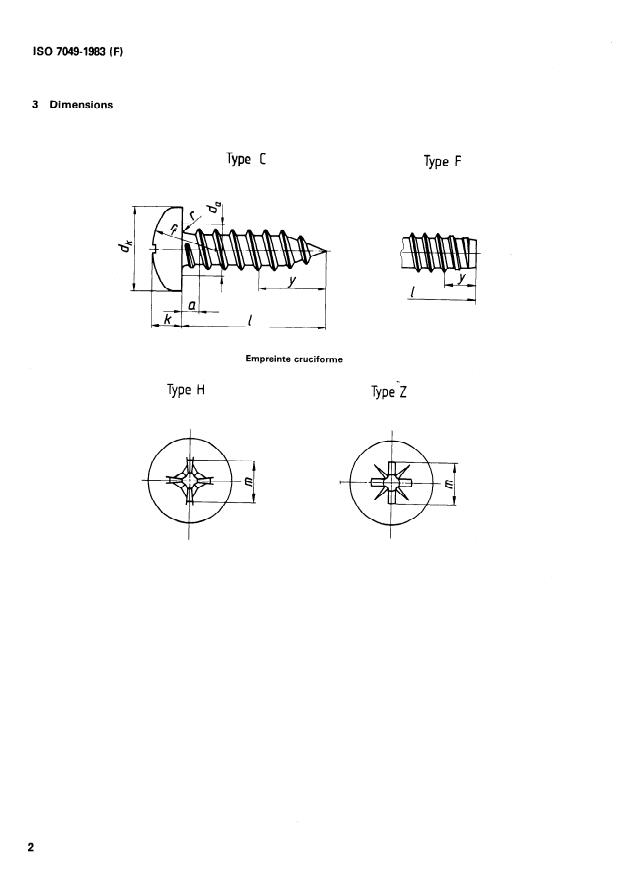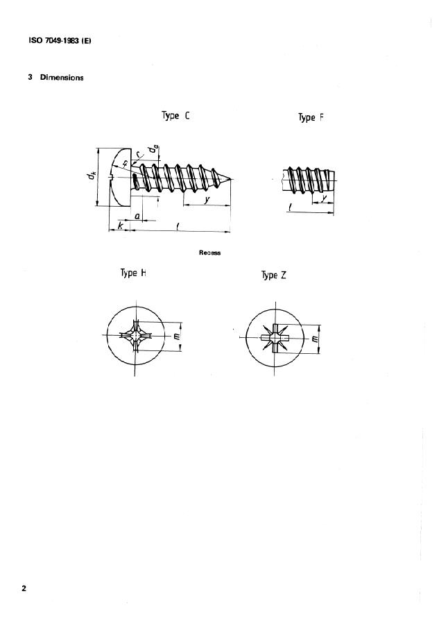 ISO 7049:1983 is a standard published by the International Organization for Standardization (ISO). Its full title is "Cross recessed pan head tapping screws". This standard covers: Specifies the characteristics of types C, F, H and Z with thread sizes form ST 2,2 up to and including ST 9,5; includes specifications with reference to International Standards; gives an example for the designation