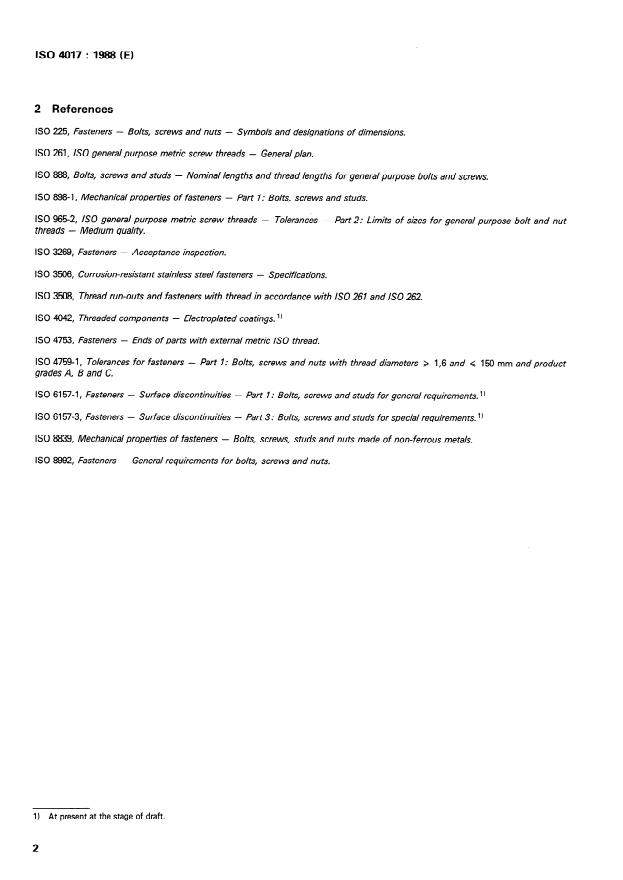 ISO 4017:1988 is a standard published by the International Organization for Standardization (ISO). Its full title is "Hexagon head screws — Product grades A and B". This standard covers: Hexagon head screws — Product grades A and B